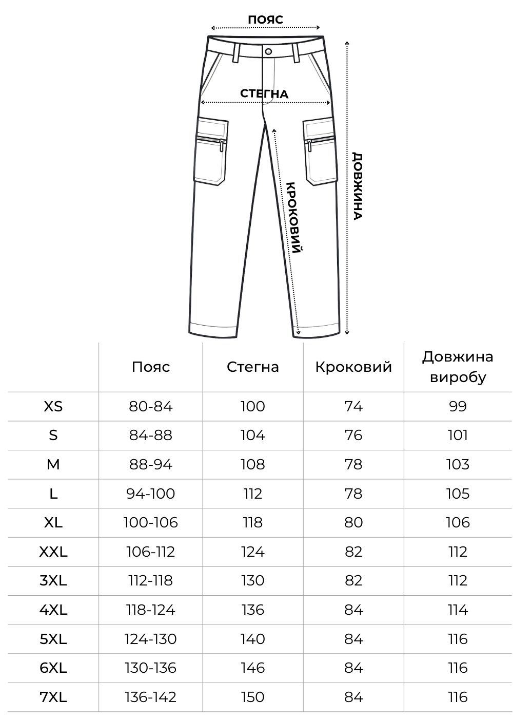 – Кишені: 2 бічні кишені для рук, 4 задні відкриті кишені, 2 кишені карго на блискавках, 1 одна прорізна кишення для телевону.